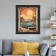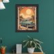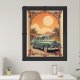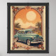 A vintage-style poster featuring a classic car in a retro urban setting. The poster has an ornate border and a warm color palette, evoking a nostalgic feel. The car is a prominent feature, with palm trees and city buildings in the background.