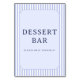 This wedding tabletop sign features a charming vintage-inspired design with vertical light blue and white stripes, creating an inviting backdrop. The central pale lavender rectangle highlights the bold, uppercase serif text "DESSERT BAR" followed by "PLEASE HELP YOURSELF!" in smaller lettering, encouraging guests to indulge. The soft color palette and classic typography evoke a warm, nostalgic atmosphere, perfect for adding a touch of elegance to any dessert station at your event.