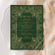 This elegant wedding menu features an ornate vintage gold frame on a distressed green background in imitation of an antique book cover. Customize the decorative gold-colored text with your menu details. The frame design is repeated on the back of the card.