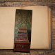 Nostalgic image featuring a stack of old worn books on a wooden desk against a background of vintage damask wallpaper.
