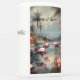 botanical painting with flamingos standing in the water surrounded by palm trees and tropical flowers