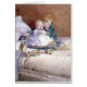 A vintage children's book illustration by Honor C. Appleton depicting a little boy sitting on a bed with his baby sister playing with a wooden train set to entertain her. Honor C. Appleton (1879-1951) was an English illustrator and artist who illustrated over 150 books in her career, beginning with children’s books and moving to literary classics. This card is blank inside for your own message.