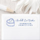 This charming return address label features a simple vintage-style cake illustration on the left side, with soft blue accents. Your name appears in an elegant blue handwritten script, while the address is printed in a classic blue serif font on the right. The clean and timeless style creates a refined look, perfect for wedding invitations, bridal shower thank you notes, or special occasion mail.
