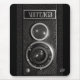This mousepad features a black vintage camera with twin lens. The camera is a mock up of what an antique European camera dating from the early 1930's might look like.