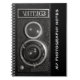 This notebook features a black vintage camera with lens on the cover. The camera is a mock up of what an antique European camera dating from the early 1930's might look like.