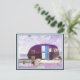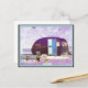 Summer fun postcard, featuring a vintage camper trailer with a picnic table. The unusual colors give the retro scene a dreamy edge.