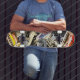 Skateboard deck with a mosaic print of classic automobiles.