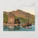 Postcard with a vintage photo lithograph of Carrick Castle in Scotland from 1895 pictures the ivy covered ruins of a red sandstone medieval tower with mountains in the background and a lake with boats in the foreground. Digitally cleaned, enhanced and artistically rendered to resemble pen and ink with watercolors. The 15th century tower house on the west shore of Loch Goil in Argyll, Scotland was reclaimed from the English by Robert the Bruce in 1307. Mary, Queen of Scots, visited in 1563.