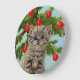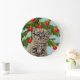 Clock featuring a vintage cat and Christmas tree! A fluffy grey kitten adorably sits in front of a green Christmas tree. The tree is decorated in red and blue ornaments. A cozy gift for the Christmas season and cat lovers!