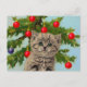 Postcard featuring a vintage cat and Christmas tree! A fluffy grey kitten adorably sits in front of a green Christmas tree. The tree is decorated in red and blue ornaments. A cozy gift for the Christmas season and cat lovers!