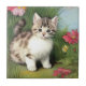 Ceramic Tile featuring a vintage kitten illustration. A fluffy white cat with dark stripes plays in a patch of grass with red flowers. A cute gift for cat lovers and Victorian art collectors.