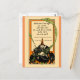 A lovely, vintage, invitation of an old witch, wearing a black cloak, and a pointed hat. She has white hair, and she is holding a wooden staff. The witch is brewing a skeleton, into a giant, black cauldron. She is with her familiar animals, a black owl, and a black cat. Green smoke, or steam, is coming out of the cauldron skeleton's eye sockets. On the greeting, it says, "Hallowe'en's the night for revels, join the fun! We want all our friends to be here, you are one!" Great for those who love old, vintage greetings, witches, owls, black cats, skeletons, or spooky Halloween stuff.