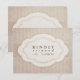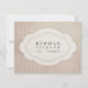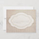 This wedding invitation response card features a striped cream background on which a darker cream ribbon bears a white emblem with scalloped edges. This curved, symmetrical form, which looks like a paper cut-out, frames the words "Kindly respond [by - customizable date]" with a swirly script flourish on the front. On the back is a line for the guest to write their name and check whether they accept or decline, and the number of guests attending. The design has a distressed, vintage, aged feel which complements the theme of simple, old-fashioned elegance.