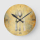 A clock with old world charm featuring some antique silverware on a weathered patina background with rich, warm hues.