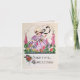 The image on this card was adapted from a vintage postcard. It shows a lovely young lady in a flower garden with what appears to be foxgloves, roses, poppies, a sunflower, and a ribbon with two hearts on it.