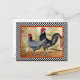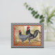 Vintage illustration of a rooster and hen chicken in the barnyard pecking for food.