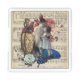 Beautiful digital collage features vintage tinted photo cutout of boy and girl couple along with vintage floral bouquets, watch and butterflies on antique music sheet.