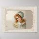 Victorian child with pretty flower green hat. Sweet face and curly auburn hair. Background is a soft ivory damask. Set of 12 vintage children illustrations by Frances Brundage. A delightful vintage collection.