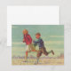 Vintage illustration children image featuring a girl and a boy running to school through the grass of a meadow. A beautiful sunny day, no time to walk, this brother and sister do not want to be late!