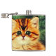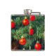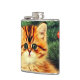 Flask featuring a vintage Christmas cat! An orange kitty with black stripes sits in the snow. Behind the cat is a Christmas tree with red and yellow ornaments. Also on the snow is a red present. A perfect gift for the Christmas season and cat lovers!