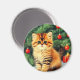 Magnet featuring a vintage Christmas cat! An orange kitty with black stripes sits in the snow. Behind the cat is a Christmas tree with red and yellow ornaments. Also on the snow is a red present. A perfect gift for the Christmas season and cat lovers!