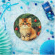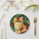 Paper Plates featuring a vintage Christmas cat! An orange kitty with black stripes sits in the snow. Behind the cat is a Christmas tree with red and yellow ornaments. Also on the snow is a red present. A perfect gift for the Christmas season and cat lovers!