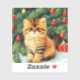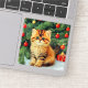 Sticker featuring a vintage Christmas cat! An orange kitty with black stripes sits in the snow. Behind the cat is a Christmas tree with red and yellow ornaments. Also on the snow is a red present. A perfect gift for the Christmas season and cat lovers!