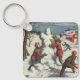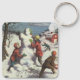 Vintage illustration Merry Christmas holiday image featuring children having fun outside with a snowball fight. The kids are throwing snowballs and building a snowman on a winter day.