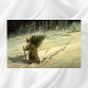 Vintage illustration antique Victorian Merry Christmas holiday design featuring an old man resembling jolly old Saint Nicholas. He is carrying a pine tree through the forest during winter leaving only footprints behind in the snow.