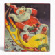 Vintage illustration Christmas holiday image featuring a jolly 50's retro Santa Claus flying a science fiction spaceship over a sleepy town on Christmas Eve.
