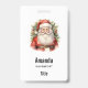 Name tag with a cute vintage style watercolor image. Santa Claus in his red suit with jolly cheeks and a smiling face. Surrounded by pine and holly.
