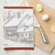 Holiday Kitchen Towel with a black and white sketch of a Victorian village - the only color being that of the street lamp and Christmas decorations.