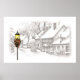 A black and white sketch of a Victorian village with the only color being that of the street lamp and Christmas decorations. Reprinted on this poster with framing options available.
