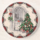 Decorate your home this Christmas with Christmas coasters showing this vintage scene of a Christmas tree by an old-fashioned window with candle light.