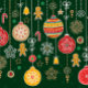 A festive seamless pattern on a dark green background, featuring a variety of Christmas-themed ornaments and decorations. The pattern includes hanging ornaments in red, yellow, and green, adorned with snowflakes and circular designs. There are also gingerbread men, stars, bells, and candy canes scattered throughout. The ornaments and decorations are suspended from strings of beads and ribbons, adding a sense of depth and movement to the design. Small green stars are dispersed across the background, enhancing the holiday atmosphere. The style is reminiscent of hand-drawn illustrations, with clean lines and a cheerful color palette, perfect for holiday-themed designs.