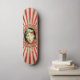 A unique and eye catching vintage skateboard design with a circus clown surrounded by a red and beige distressed sunburst stripes pattern. The stripes and clown image have a trendy worn look.