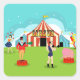 Step right up, folks! Step right up to the amazing Vintage Circus Stickers. Yes, come one, come all! This mid century modern, minimalist art design features a cartoon drawing of a genuine, three-ring circus. Take it all in. On the lush, green grass, you can see a ringmaster wearing a red coat with tails, orange pants, and a black top hat. In one hand he is holding a green megaphone, which allows him to be heard while telling you to step right up! Behind the ringmaster, there is a beautiful woman juggling five balls. Judging from the stars on her navy skirt and orange top, she is a star of the show. To the left of the man with the megaphone, we see a brawny, muscleman. It takes confidence to pull off a navy, one-shouldered, unitard, but Mr. Strong Man does it with style. My goodness! Check out those bulging biceps as his lifts that dumbbell as if it's as light as a feather. His black, handlebar mustache looks as manly as the rest of him. To the left of the body builder, there is a pink, baby elephant standing on a red podium. Don't worry. The juvenile pachyderm appears to be as tame as a kitten. Toward the rear of the scene, we can see a mad-capped man making a real clown of himself. He didn't buy that red and yellow, harlequin style suit off the rack! His blue hat, orange and yellow hair, white face paint, and red nose would make him unrecognizable to his own mother. And this is only the excitement we can see! Who knows what lively antics are playing out in the three big tops that grace the background! Two blue and aqua tents are flanking a giant red and cream striped big top tent with yellow and black letters that spell out, "CIRCUS." A yellow, banner flag is waving from the top of each tent. The sky is shades of aqua, teal, blue and white and is filled with magical, white stars. Just like the circus itself, this design is fun for the whole family and is perfect for children of all ages!