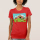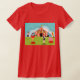 Step right up, folks! Step right up to the amazing Vintage Circus T-Shirt. Yes, come one, come all! This mid century modern, minimalist art design features a cartoon drawing of a genuine, three-ring circus. Take it all in. On the lush, green grass, you can see a ringmaster wearing a red coat with tails, orange pants, and a black top hat. In one hand he is holding a green megaphone, which allows him to be heard while telling you to step right up! Behind the ringmaster, there is a beautiful woman juggling five balls. Judging from the stars on her navy skirt and orange top, she is a star of the show. To the left of the man with the megaphone, we see a brawny, muscleman. It takes confidence to pull off a navy, one-shouldered, unitard, but Mr. Strong Man does it with style. My goodness! Check out those bulging biceps as his lifts that dumbbell as if it's as light as a feather. His black, handlebar mustache looks as manly as the rest of him. To the left of the body builder, there is a pink, baby elephant standing on a red podium. Don't worry. The juvenile pachyderm appears to be as tame as a kitten. Toward the rear of the scene, we can see a mad-capped man making a real clown of himself. He didn't buy that red and yellow, harlequin style suit off the rack! His blue hat, orange and yellow hair, white face paint, and red nose would make him unrecognizable to his own mother. And this is only the excitement we can see! Who knows what lively antics are playing out in the three big tops that grace the background! Two blue and aqua tents are flanking a giant red and cream striped big top tent with yellow and black letters that spell out, "CIRCUS." A yellow, banner flag is waving from the top of each tent. The sky is shades of aqua, teal, blue and white and is filled with magical, white stars. Just like the circus itself, this design is fun for the whole family and is perfect for children of all ages!