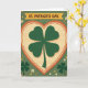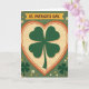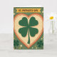 This card shows a vintage-style St. Patrick’s Day scene where a large emerald four-leaf clover sits inside a cream-colored heart, like a quiet token shared between close friends 💚. The heart is outlined by a rustic double border in distressed orange-red and off-white, giving the edges a softly worn, time-kept look. Behind it all, a muted sage green background is lightly textured and dotted with small shamrocks and tiny blossoms in soft white and sunny yellow ☘️. At the top, a warm gold banner carries the text “ST. PATRICK’S DAY.” in dark serif letters, with “GREETINGS” placed just below in smaller, understated type. The speckled grain, faded corners, and scuffed details across the whole design feel like an old print kept in a drawer and brought out for someone special. Subtle horizontal lines inside the cream heart add gentle rhythm, like a calm pause around the clover at the center. Small shamrocks and little flowers scatter around the heart on the sage background, with the gold banner hovering above.