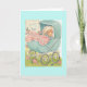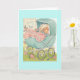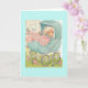 A vintage greeting card image features a newborn baby snuggled into a pastel blue carriage with a pink and white blanket. The front of the card says, "Congratulations to You and Baby" and the message inside the card is, "Wishing you a lifetime of happiness, laughter and joy."