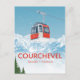 This crisp Vintage Courchevel Travel Poster Postcard captures the exhilarating atmosphere of the famous French Alps ski resort, featuring a bright red Gondola rising over snow-capped mountains.