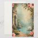 A stationery design that feels like stepping into a dream. The scene opens onto an ornate baroque courtyard, framed by sculpted stone archways and delicate architectural flourishes that evoke centuries‑old European gardens. At the center, a graceful water fountain glimmers with a soft, pearlescent sheen, its gentle cascades adding a sense of serenity and movement.