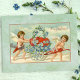 Two smiling winged cupids pulling a small cart filled with blue forget-me-nots and red hearts to Valentine greeting with pastel teal background.