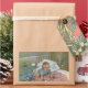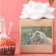 Vintage illustration children and babies image featuring a cute baby playing with toys in a crib after waking up from a nap. Adorable rabbits, a duck and a wolf with a basket decorate the crib and blanket. Neutral colors make this a great design for a boy or a girl!