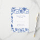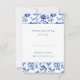 This beautiful RSVP response card features a classic Delftware-inspired blue floral design, with intricate blooms. The charming blue and white color palette exudes a timeless, vintage feel, perfect for complementing a traditional or formal wedding theme. The options for “joyfully accepts” and “regretfully declines” offer a touch of refinement and personality, making this card a lovely way for guests to RSVP. Its unique arch design combined with the sophisticated floral border ensures your wedding suite will feel elegant and cohesive.