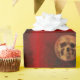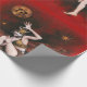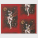 This wrapping paper is illustrated with a vintage devil lady dancer. The background is red with a skull faced moon and stars.