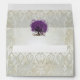 Whimsical Magical Tree of Love Purple Heart Leaf Tree on Tea Stained Warm Silver Toned Metallic Paper with an Overlay of Antique Sheet Music and some cute little swirly designs to enhance the roots of love on this unique woodland wedding invitation...