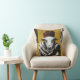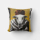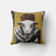 This throw cushion is illustrated with a vintage diva sheep is portrayed with 1940s elegance, adorned in a luxurious furcoat and a stylish red turban. The background features a warm golden hue adding a classic and sophisticated feel.