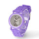 I only have one complaint. I ordered the watch with clear case and strap, and what was sent was white case and strap. I'm going to keep it because 1) it looks very nice in white, and 2) it would take too long to get a replacement made and sent in time for my occasion. Aside from the mix up with the color, the watch does look very good in white. The purple dial is actually sparkly which did not show in the online images. That was a nice surprise. If you like Swatch watches this is very similar to those. It's 33.6mm in diameter, 10.5mm thick, and 40.6mm lug to lug. Stainless steel case back says 3ATM/30m WR, so no swimming or showering or submerging this one. If you like Woodstock, this is a great choice.