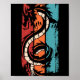 A stylized dragon is depicted against a background of vertical stripes in vibrant vintage colors. The dragon's form is minimalist, focusing on its powerful silhouette and flowing lines. The overall aesthetic is reminiscent of retro design trends, with a touch of grunge and urban flair.